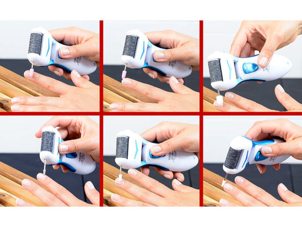 Étape suivante : le soin des ongles. 5 accessoires différents peuvent être fixés successivement sur l'appareil, et vous permettent d'éliminer les cuticules, puis de limer, mettre en forme, lisser et polir les ongles. Sur les mains comme sur les pieds, vos ongles retrouvent un aspect parfaitement soigné.