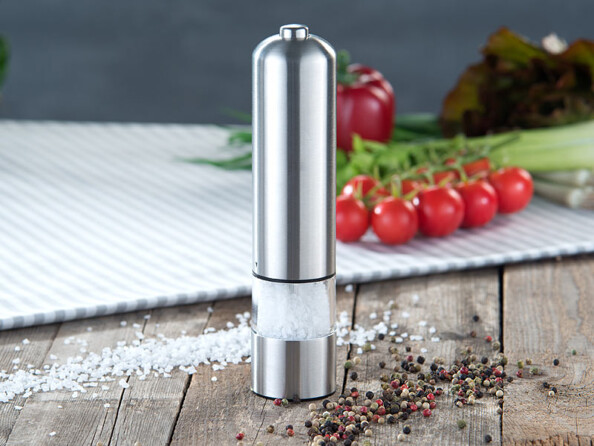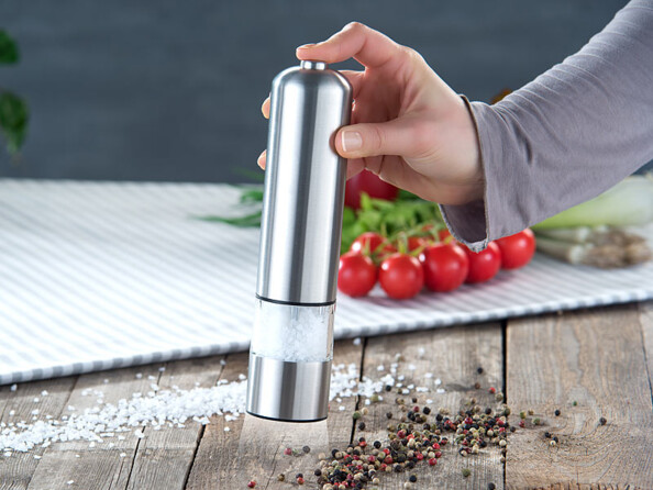 Appuyez simplement sur un bouton, et le sel ou le poivre est moulu automatiquement. Le petit plus : une LED éclaire les grains moulus qui tombent dans le plat ou l'assiette.