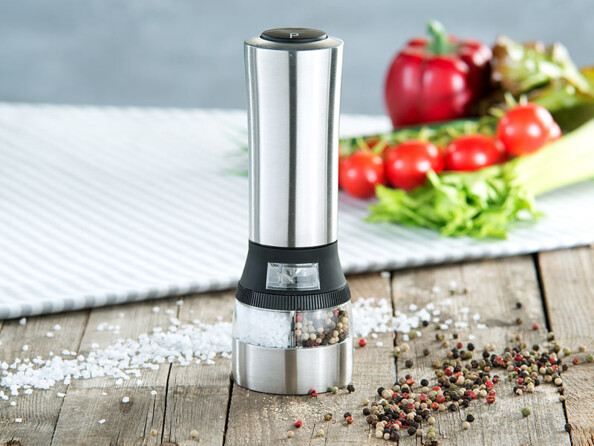 Moulin poivre et sel 2 en 1 avec broyeur en céramique 22 cm - électriqueVous avez désormais plus de place sur la table : l'astucieux moulin double avec deux compartiments à épices offre de la place pour le sel et le poivre ou d'autres épices.