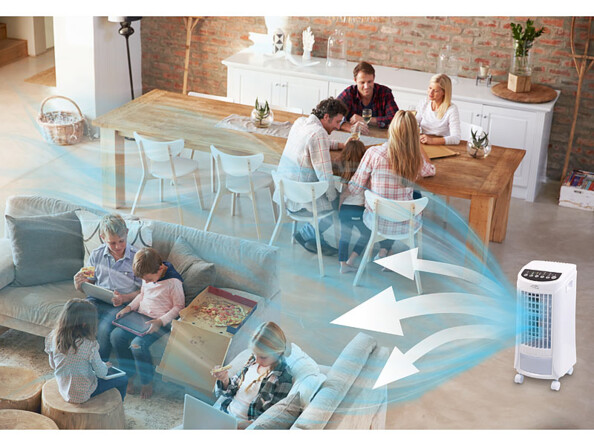Réglez le rafraîchissement parmi 3 niveaux, selon vos besoins. Grâce à la fonction d'oscillation, l'air frais est réparti de façon optimale dans la pièce. Pratique, le minuteur intégré vous permet de programmer le démarrage de l'appareil, de façon à préparer votre salon pour votre retour du travail, par exemple. Obtenez ainsi une atmosphère plus fraîche et plus agréable sans les inconvénients d'un climatiseur : pas d'air modifié, seulement un flux d'air frais obtenu par interaction avec l'eau fraîche stockée dans le réservoir spécifique.