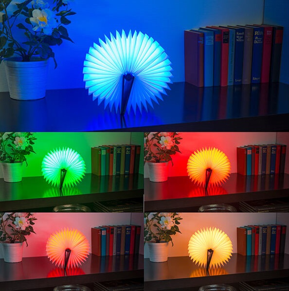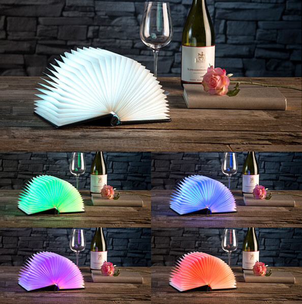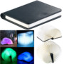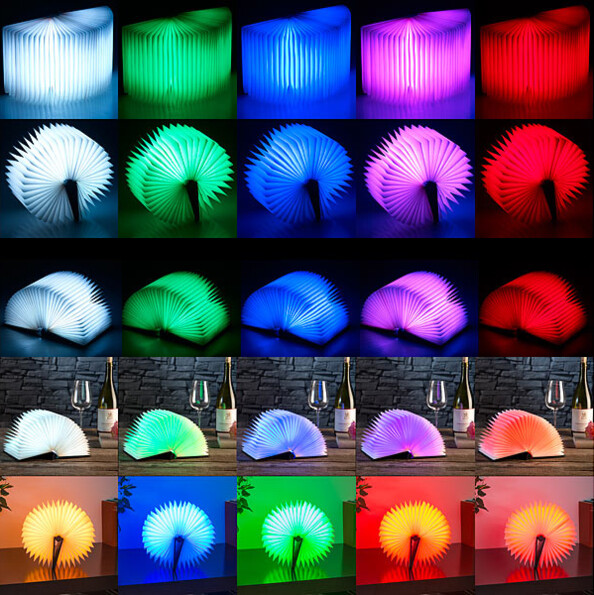 Choisissez la couleur de la lumière en ouvrant et fermant le livre : rouge profond, bleu mélancolique, vert apaisant… vous pouvez même poser le livre en position semi-ouverte pour diffuser de la lumière en continu. Refermez la lampe pour la ranger en toute simplicité : cette dernière n'est pas plus encombrante qu'un petit cahier.