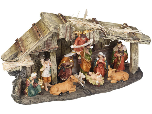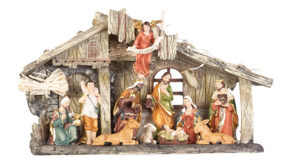 - 11 figurines peintes à la main : enfant Jésus, ange, Marie, Joseph, Gaspard, Melchior, Balthazar, âne, bœuf, berger et mouton