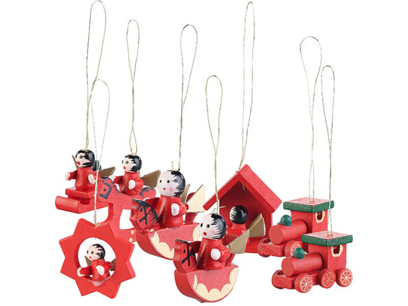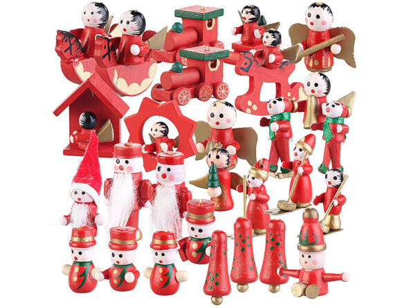 - 30 figurines sculptées et peintes à la main : anges, chevaux à bascule, luges, étoiles, locomotives, casse-noisettes, Père Noël, etc.
