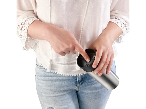 À l'instar du café à emporter, le gobelet est pourvu d'un couvercle Quick Press facile à fermer et ouvrir, et empêchant les éventuels débordements.