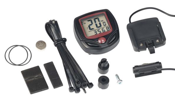 - Compteur vélo avec pile bouton, support avec câble et capteur, aimant, 2 patchs adhésifs, 7 attache-câbles et mode d'emploi en français