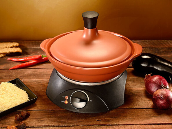 Ce tajine électrique allie tradition et modernité, avec un plat en terre cuite traditionnel, et une température régulée par thermostat. Grâce à la terre cuite, la chaleur est répartie de manière particulièrement homogène. La viande et les légumes mijotent ainsi lentement dans leur jus sous le couvercle. Pour une cuisine aussi saine que savoureuse.