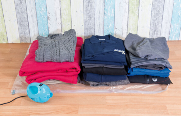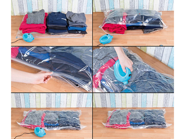 Avant de refaire votre valise, glissez vos affaires dans les sacs à vêtements, et aspirez à l'aide de cet appareil de mise sous vide. Sans effort, le contenu du sac est compacté de jusqu'à 75 %. Imaginez le gain de place, et tout ce que vous pouvez emporter en plus dans votre sac de voyage et dans votre coffre.