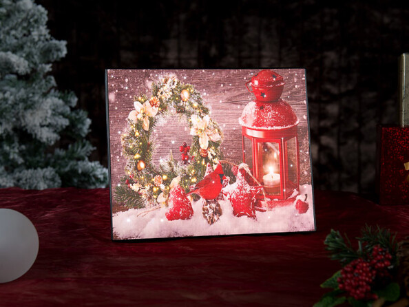 Le tableau à LED "Couronne de Noël et lanterne" représente une nature morte enneigée, avec une lanterne, une couronne, et diverses décorations. L'ambiance hivernale et la magie de Noël résumée en une seule image.