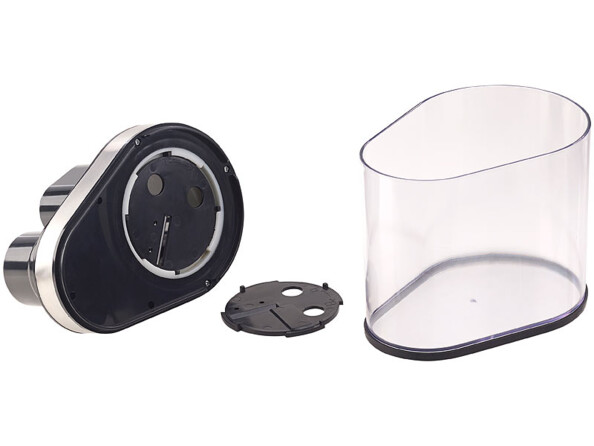 - Mixeur plongeur et coupe-légumes à spirale électrique 2 en 1, embout à trancher, 2 disques à trancher (tranches / bandes), bouchon, réservoir collecteur, embout mixeur, mode d'emploi en français
