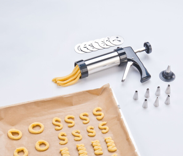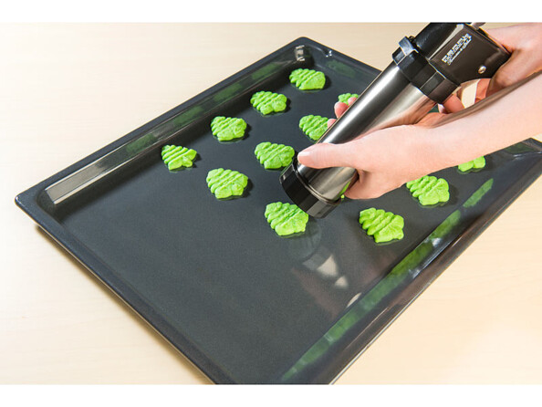 Envie de petits gâteaux à la forme originale ? Pour Noël ou pour accompagner votre thé, réalisez des fournées entières de biscuits bien réguliers. Placez simplement le disque correspondant à la forme choisie dans le pistolet, et remplissez-le de pâte. Il ne vous reste plus qu'à appuyer sur la gâchette pour la pâte sortir du pistolet. Une fois la pâte cuite, le biscuit prend forme. L'avantage de cette technique : même les formes les plus complexes sont toujours réussies. Et vous pouvez même obtenir de délicieux spritz !