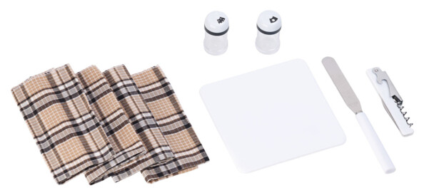 - Contenu : 4 fourchettes, 4 couteaux, 4 cuillères, 4 serviettes en tissu, salière, poivrière, limonadier, couteau à beurre, planche à découper