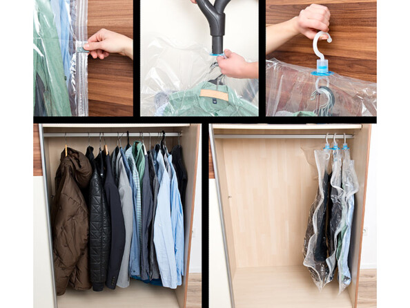 Utilisation très simple : placez les vêtements dans le sac et aspirez l'air à l'aide d'un aspirateur. Le volume du sac et de son contenu est aini réduit jusqu'à 75%. Rangez alors vos vêtements sans souci dans votre penderie, ou même dans une cave ou un grenier. Votre linge est protégé des odeurs, de l'humidité et des mites.