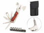 - 17 fonctions intégrées : couteau denté, couteau, lime, petit tournevis cruciforme, grand tournevis plat, hachette, pince de serrage, marteau de secours, support à 4 pans pour embouts, casse-noix, pince coupante, scie, dégorgeoir, clé de serrage, ciseau, ouvre-bouteille et dénudeur de câble
