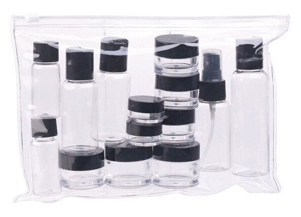 Seules de petites quantités de liquides et de crèmes sont autorisées. Le set de voyage de 15 pièces est la solution parfaite ! Les 4 fioles en plastique et les 8 pots à la quantité maximum autorisée par les compagnies aériennes offrent suffisamment d'espace pour vos produits de beauté. Remplissez avec du shampooing, savon liquide, gel douche, lait solaire, parfum, lotion de rasage et bien plus encore.