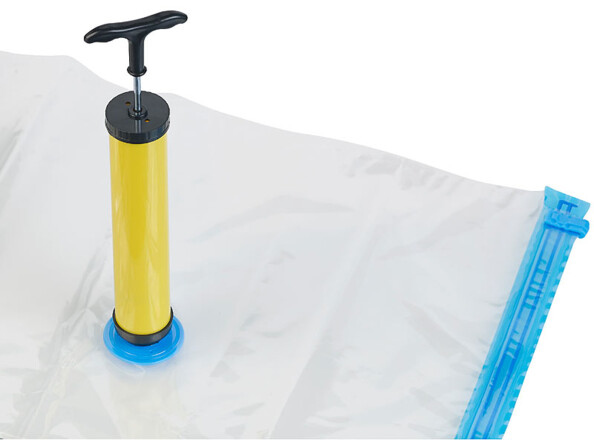 Et après les vacances, repliez les vêtements de manière tout aussi compacte : la pompe à main pratique permet d'aspirer l'air contenu dans les sacs, sans électricité ni aspirateur, pour que tout rentre à nouveau dans vos bagages à votre départ.