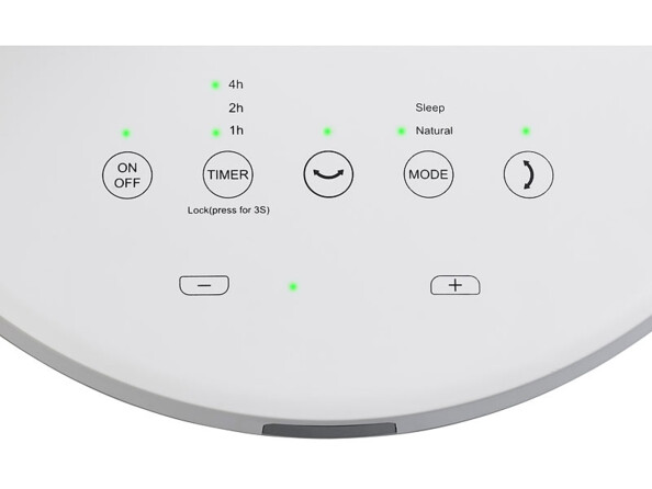 - Utilisation facile par 7 touches tactiles : marche/arrêt, mode, vitesse, oscillation et minuteur