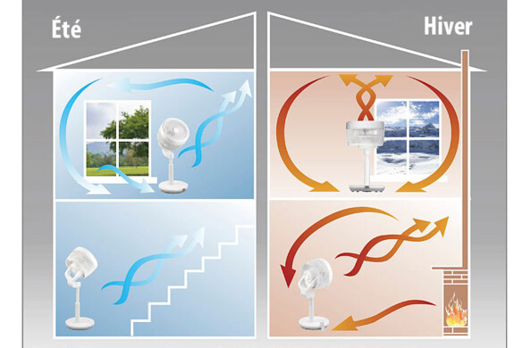 Vous pourrez ainsi profiter d'une brise agréable par temps chaud. Et pendant la saison froide, vous répartissez la chaleur du chauffage de manière optimale dans la pièce ! Réalisez ainsi des économies d'électricité et de chauffage : en faisant circuler l'air, votre ventilateur augmente de manière significative l'effet du chauffage et de la climatisation.