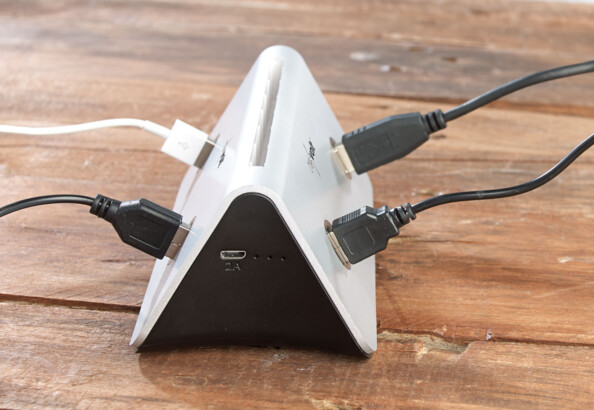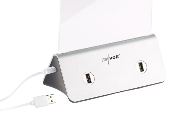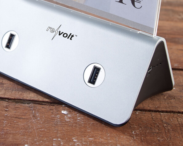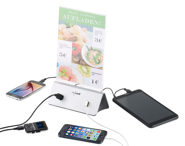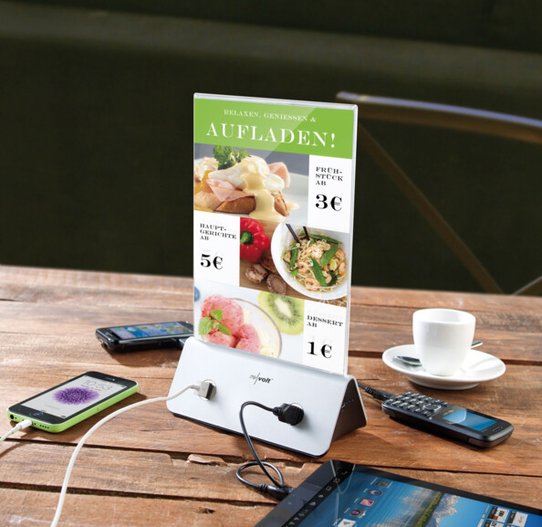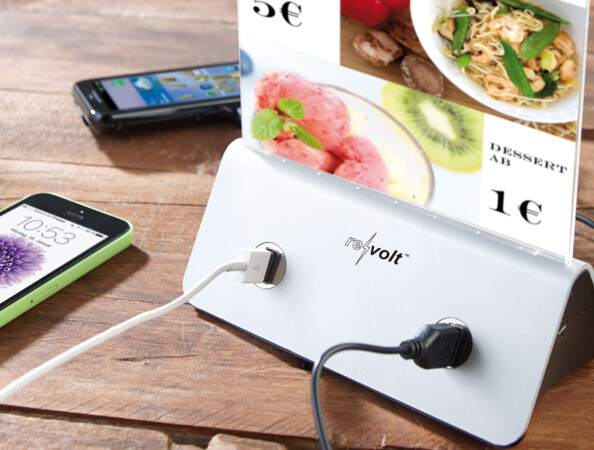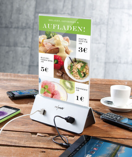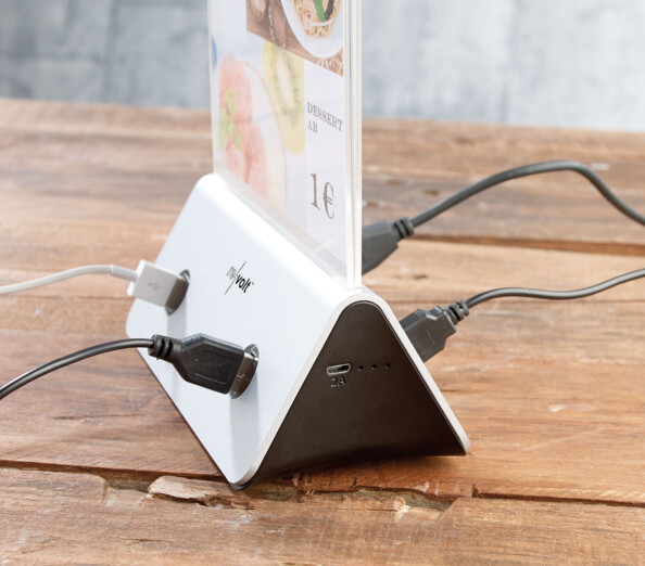 À première vue, il s'agit d'un support classique pour menu ou plaquette publicitaire. Mais il renferme une batterie avec 4 ports USB. Vos clients peuvent ainsi brancher leur smartphone directement sur le porte-menu et recharger leur appareil grâce à un courant de 2 A.
