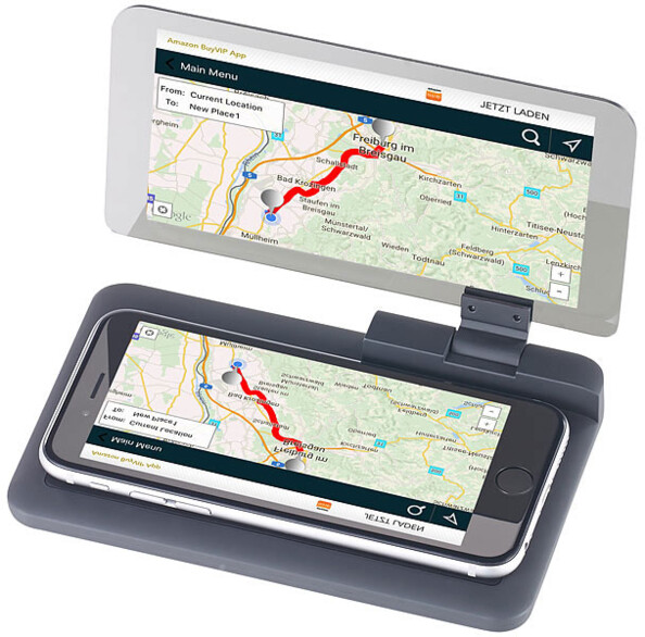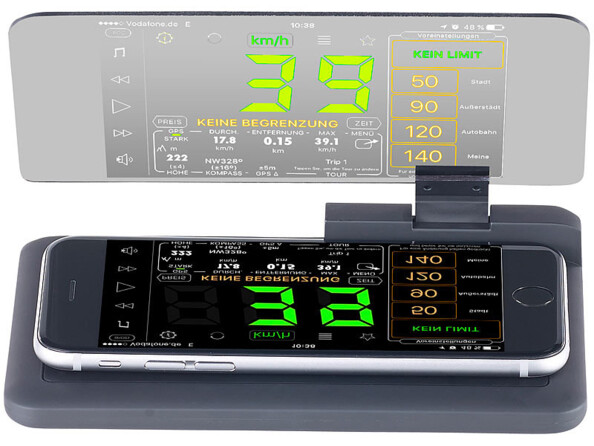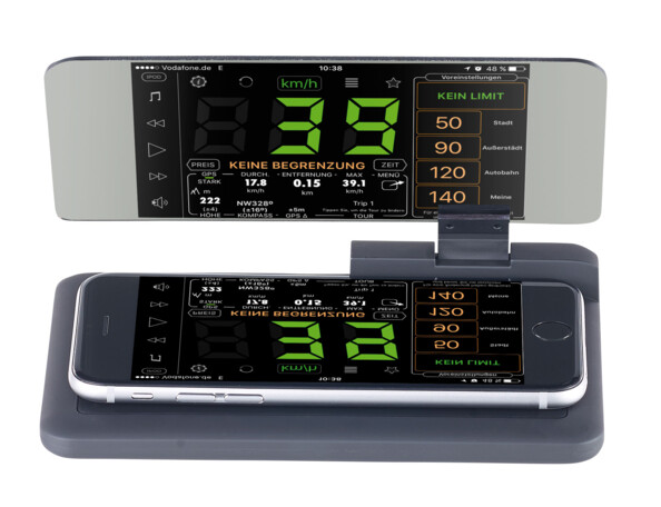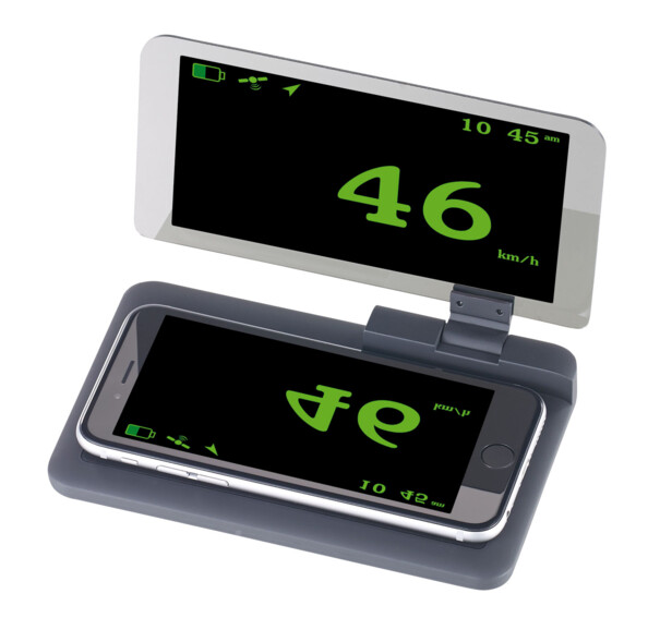 Pour utiliser ce système d'affichage tête-haute "HUD", il vous suffit de télécharger l’application "DigiHUD" ou "Awesome HUD" sur votre smartphone Android ou iOS. Posez le smartphone sur le support antidérapant, et vous pouvez projeter le contenu de l'écran sur la surface de projection. Vous pouvez alors visualiser la vitesse, l’itinéraire de votre parcours ainsi que de nombreuses autres données. Grâce à la surface antidérapante et au support autoadhésif, votre smartphone reste bien en place tout au long du trajet.