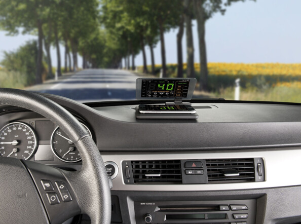 - Support antidérapant autoadhésif : fixez votre afficheur tête haute à l'endroit choisi du tableau de bord, en toute sécurité