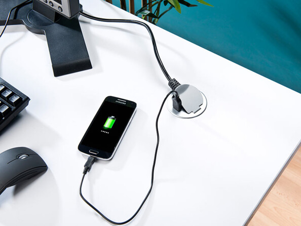 Glissez la prise dans votre bureau ou votre table pour bénéficier d'une source d'alimentation à la fois discrète et peu encombrante.