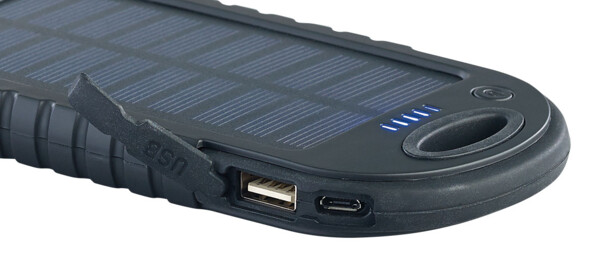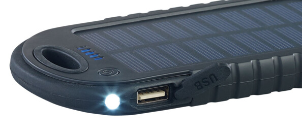 - 5 LED de statut bleues : 4 pour le niveau de charge de la batterie, 1 pour le processus de chargement par panneau solaire