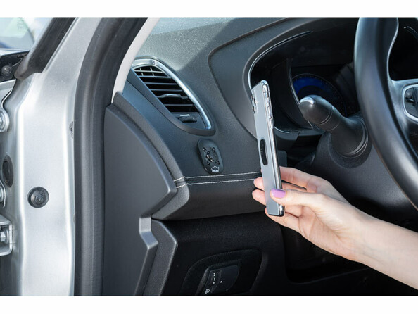 Collez simplement le support volant au dos de votre appareil mobile, puis sur le socle du volant ou du tableau de bord. Il suffit alors d'encliqueter les deux parties l'une dans l'autre pour fixer l'appareil.