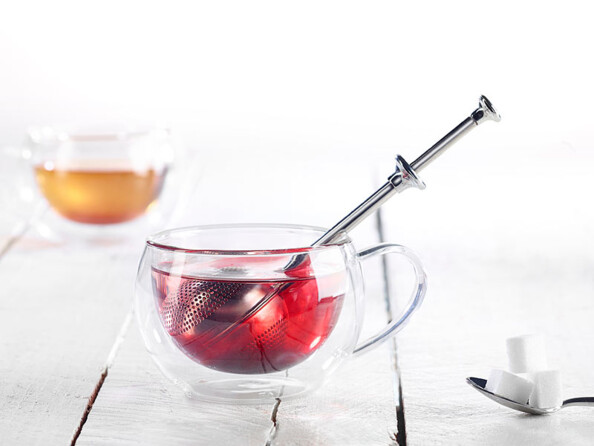 Placez le tamis à thé directement dans une théière ou un verre à thé. Dans la boule à thé, les feuilles de thé se déploient librement et libèrent tout leur arôme dans l'eau chaude. Un vrai régal !