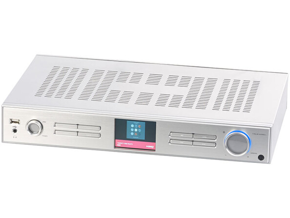 - Connectique à l'arrière : Sortie Cinch stéréo, Line-In, Line-Out, TOSLINK (sortie optique), coaxial (sortie numérique), RJ45 (LAN) ; à l'avant : USB et prise casque (prise jack 3,5 mm)