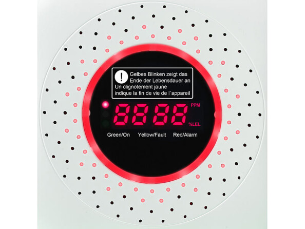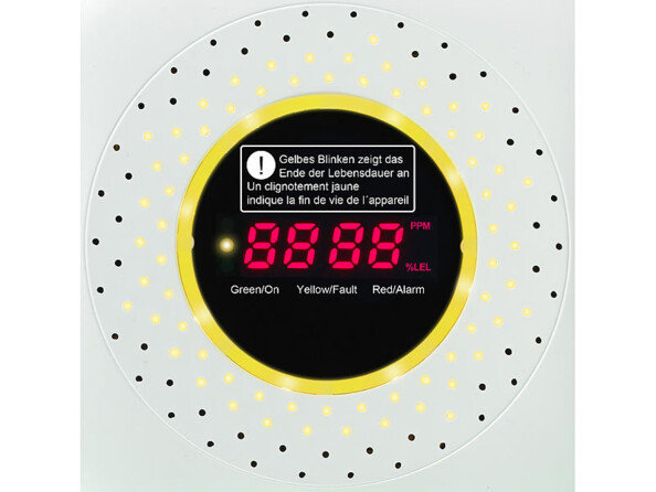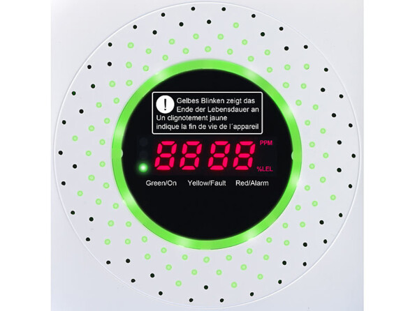 Ce détecteur de gaz est sensible aussi bien au méthane qu'au butane, propane et GPL. Il vous avertit en cas de fuite, dès que la concentration de gaz dans l'air dépasse la concentration de 2500 ppm, il déclenche une puissante alarme sonore accompagnée d'un message vocal, et cela jusqu'à ce que la concentration en gaz soit revenue à la normale. Pour une information précise, la concentration en gaz est indiquée en temps réel sur l'écran à LED.