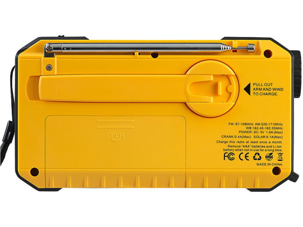 - Chargement par cellule solaire intégrée, manivelle ou USB (adaptateur secteur non fourni)