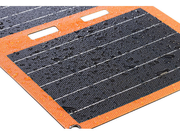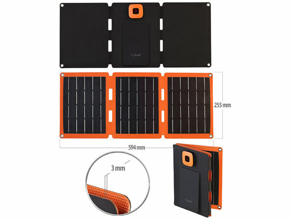 - Dimensions du panneau solaire plié : 25,5 x 19,5 x 1,8 cm, déplié : 59,4 x 25,5 x 0,3 cm