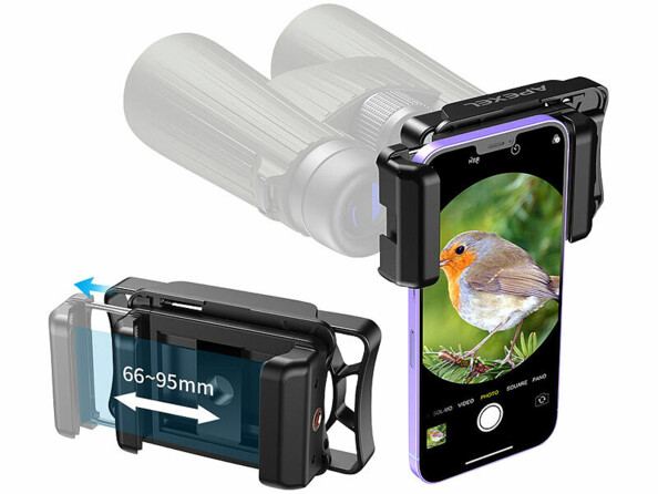 Grâce à sa pince réglable et à ses entretoises, le support universel est compatible avec tous les smartphones et instruments d'optiques courants. L'installation se fait simplement, la mise en marche en deux temps trois mouvements.