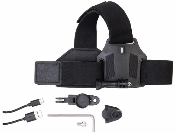 - Appareil de vision nocturne avec bandeau frontal, housse de transport, chiffon de nettoyage, sangle de transport, câble de chargement USB (USB-A vers USB-C) et mode d’emploi en français