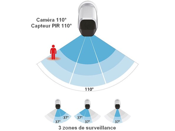- Angle de détection à 110° avec 3 zones de surveillance réglables (chacune env. 37°) : panoramique, centrale, centrale/droite, centrale/gauche