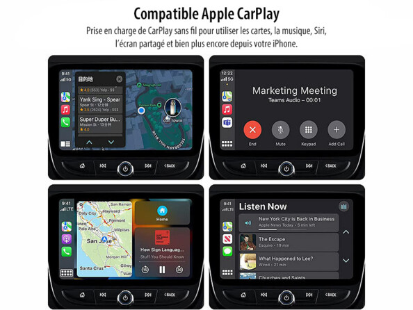- Compatible avec tous les autoradios Apple CarPlay filaires : accès sans fil aux applications iPhone telles que la navigation, les appels, les messages, la lecture de musique, Siri, etc.