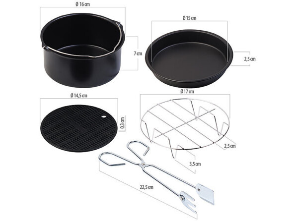 - Dimensions pot (Ø x H) : 16 x 7 cm, plaque (Ø interne x H) : 15 x 2,5 cm, tapis en silicone (Ø x H) : 14,5 x 0,3 cm, grille (Ø x H) : 17 x 3,5 cm (écart grille : env. 2,5 cm), pince : 22,5 x 3 x 3,5 cm