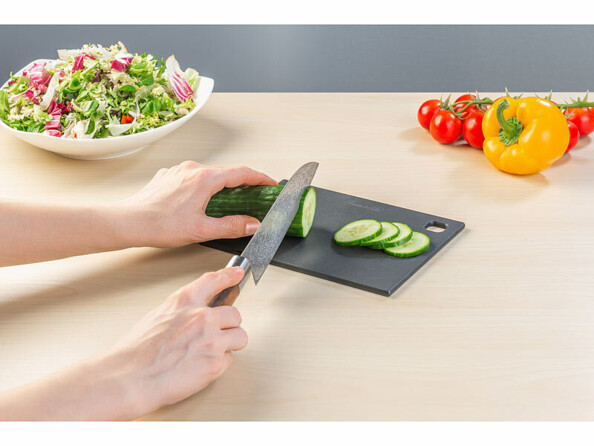 Cette planche à découper en fibres de bois 20 x 15 cm vous permet de couper vos tomates ou vos pommes en quartiers, de détailler vos oignons ou votre fromage en dés et de hacher vos herbes ou vos noix. Grâce à la poignée incrustée, la planche est facile à attraper et à maintenir. En outre, contrairement aux autres planches en bois, celle-ci peut aller au lave-vaisselle après utilisation. Elle est donc facile à nettoyer.