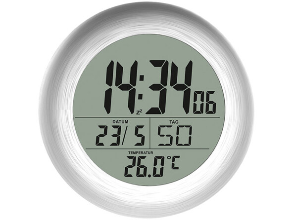 L'écran LCD peut être lu de loin et l'heure se règle toute seule par signal DCF77. Le thermomètre intégré vous indique la température de la pièce et le calendrier vous rappelle la date.