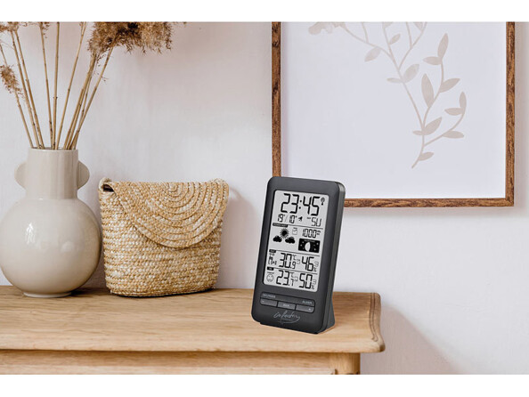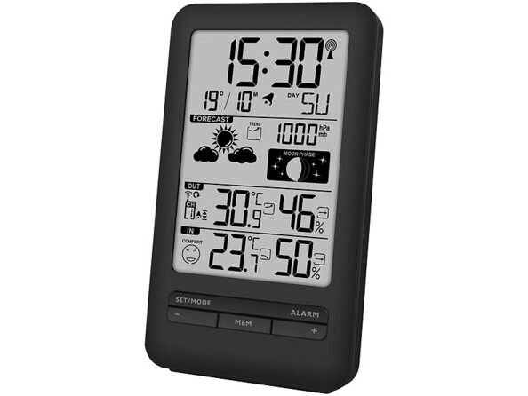 Le grand écran LCD vous permet de lire rapidement et facilement toutes les valeurs mesurées. L'heure, la date, le jour de la semaine et la phase lunaire actuelle sont également affichés. L'indicateur de confort d'humidité de l'air en 5 niveaux vous donne un aperçu pertinent sur le climat ambiant.