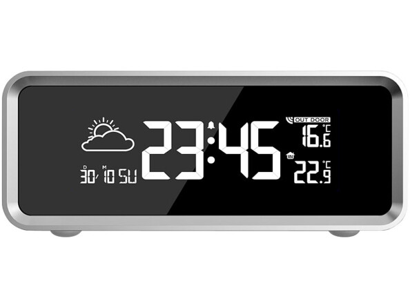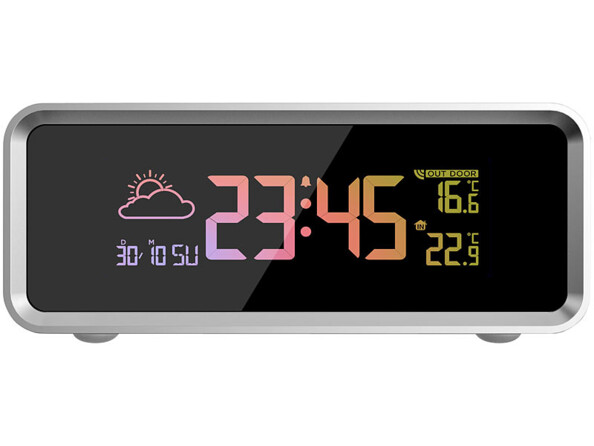 Surveillez les températures en intérieur et extérieur grâce au grand écran LCD. En plus, les six icônes vous donnent la tendance globale de la journée (ensoleillé, légèrement nuageux, nuageux, pluvieux, orageux, neigeux). Vous savez ainsi si vous devez sortir le parapluie ou la crème solaire !