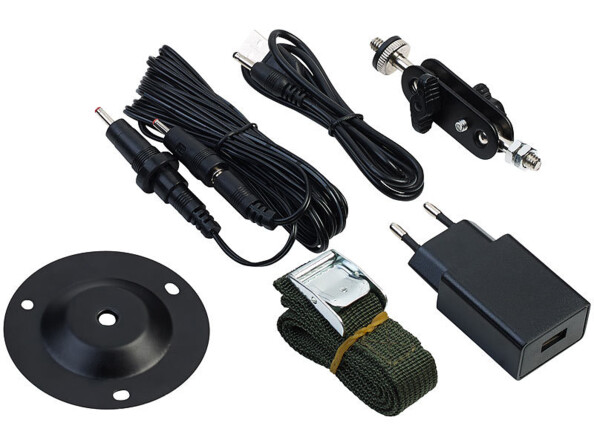 - Panneau solaire mobile PB-65.solar, câble de connexion, câble de chargement USB, adaptateur secteur USB, trépied pour arbre, sangle de fixation, matériel de montage, mode d'emploi en français