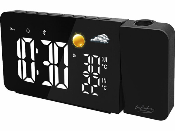Grâce à la station météo sans fil FWS-320.pro de la marque Infactory et à son capteur extérieur sans fil, vous gardez constamment un œil sur la température intérieure et extérieure. Des symboles clairs affichés à l’écran vous indiquent également la phase actuelle de la lune et la tendance météorologique. De plus, la station météo projette l’heure et la température sous forme de grands chiffres blancs au mur ou au plafond. L'élément de projection pivotant vous permet quant à lui d’orienter la projection comme bon vous semble. Ainsi, vous savez exactement à quel moment vous pouvez laisser votre imperméable à la maison ou non.