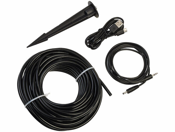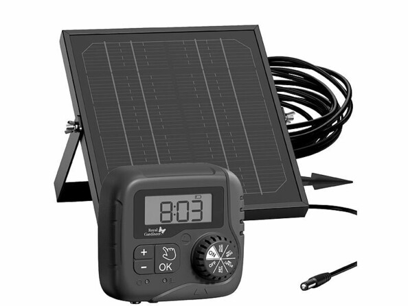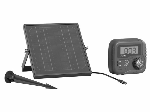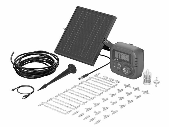 - Pack de 2 systèmes d'arrosage solaires avec programmateur d'arrosage avec pompe intégrée, batterie, panneau solaire avec câble de raccordement, piquet, support mural, tuyau (15 m), 15 goutteurs d'arrosage, 15 raccords en T, 5 raccords droits, 3 raccords cruciformes, 3 embouts de fermeture, filtre, vanne anti-refoulement, câble de chargement USB (USB-A vers USB-C), détecteur de niveau d'eau (câble) et mode d’emploi en français