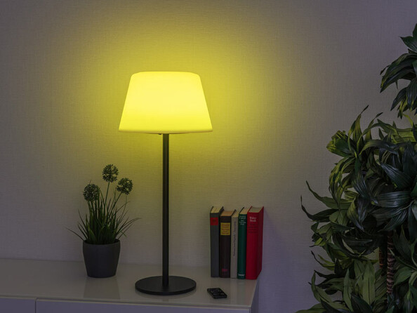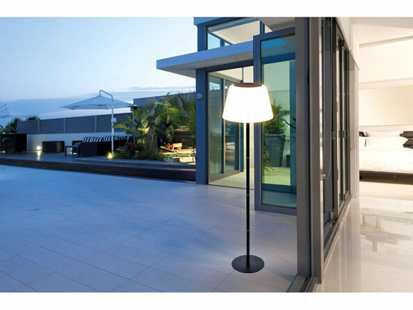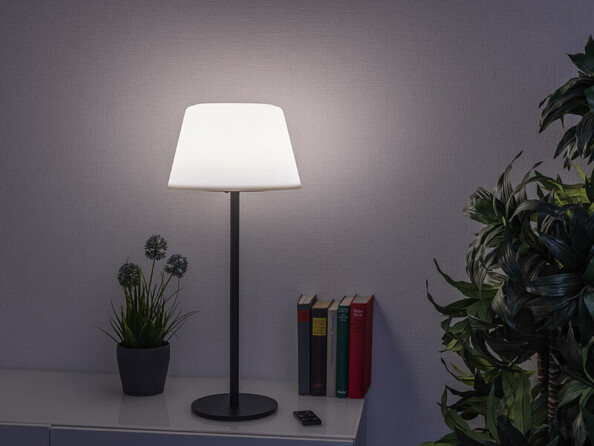 La lampe sur pied solaire télécommandée LED CCT de la marque Lunartec éclaire élégamment votre terrasse et votre balcon : installez-la en extérieur à l'abri des intempéries et profitez d'une lumière agréable lors des douces soirées d'été.