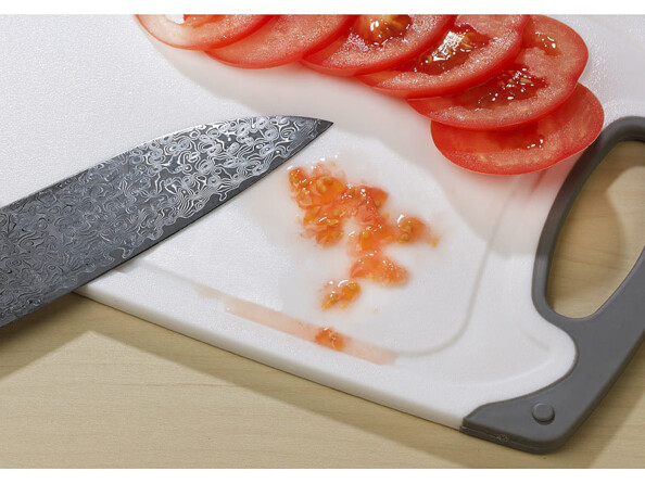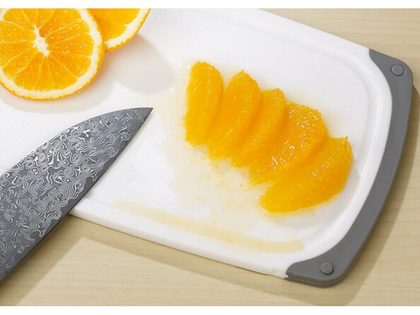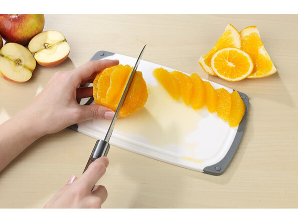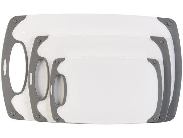 Pratique : chaque planche est dotée d'une rainure permettant de récupérer le jus et de couper ainsi plus proprement. Mais leur atout réside surtout dans leur surface avec revêtement spécial en plastique, compatible lave-vaisselle et donc particulièrement hygiénique et facile à nettoyer. Le petit plus : les planches sont antidérapantes !
