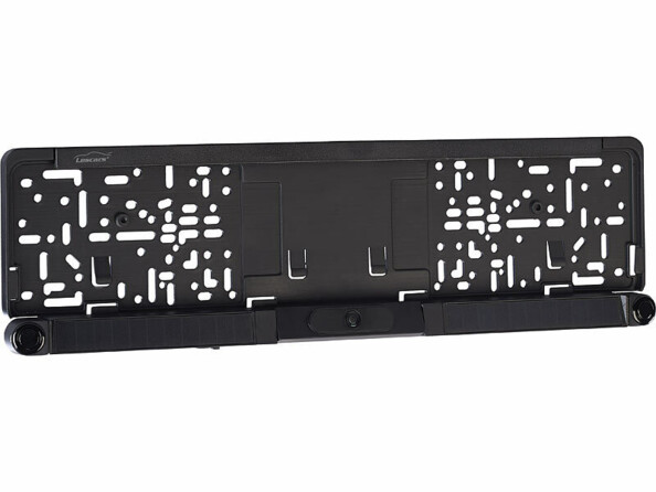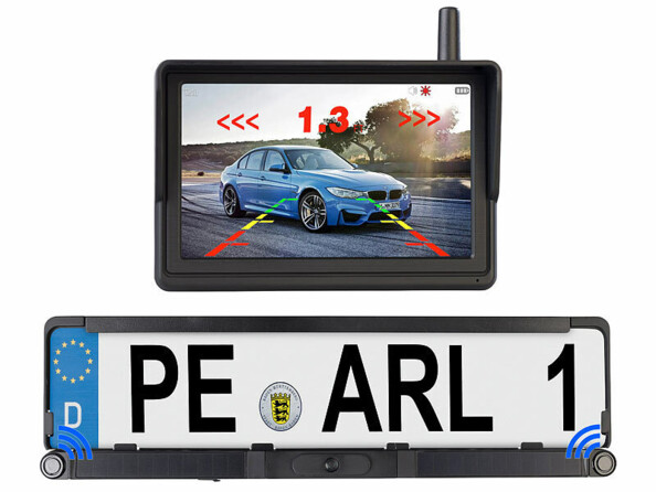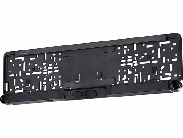 - Support pour plaque d'immatriculation avec caméra et capteurs, moniteur, adaptateur allume-cigare, câble de chargement USB (pour la batterie de la caméra), support à ventouse pour moniteur, matériel de montage, mode d'emploi en français