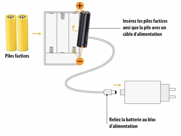 En effet, ce pack contient un adaptateur pouvant remplacer jusqu’à quatre véritables piles AAA et un second adaptateur pouvant remplacer jusqu'à quatre piles AA. Et ce par le biais de quatre piles factices reliées par un câble chacun. En utilisant ces fausses batteries, ils alimentent vos décorations de fêtes et autres articles fonctionnant sur piles par le biais d’une prise électrique. Tout en veillant bien entendu à n’utiliser que la tension dont ils ont besoin pour fonctionner.