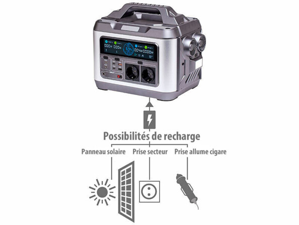 - Batterie LiFePO4 haute performance intégrée 1120 Wh, chargement par 12 ou 230 V ou par panneau solaire