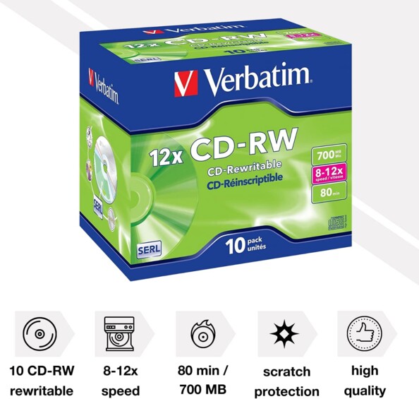 - Lot de 10 CD-RW à gravage rapide, par Verbatim